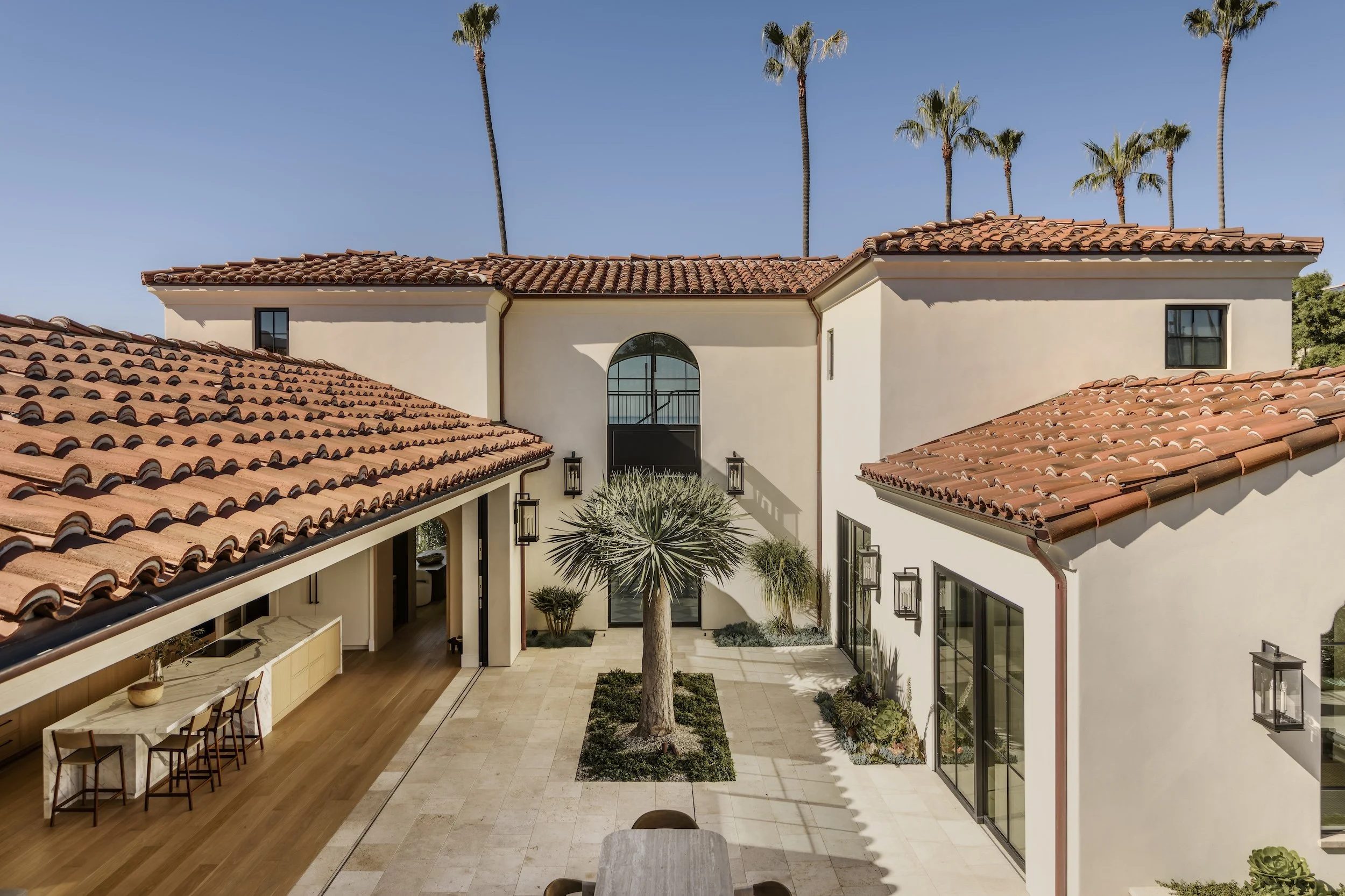 This La Jolla renovation is a study in craftsmanship and precision — a home where every detail was shaped by hand and every challenge became an opportunity. The design centers on organic, flowing forms: elliptical wood arches with continuous grain running seamlessly around each curve, a sculptural entry staircase with a railing hand-carved on site to resemble a piece of driftwood, and over 35 feet of sliding glass that pocket completely out of sight. Behind that effortless indoor/outdoor connection sits a massive structural steel beam engineered to carry the full weight of the roof, with ceiling pitches and exterior finishes carefully adjusted so it reads as though it was always part of the home. Neutral tones and natural curves replace rigid edges throughout, giving the house an organic warmth that blends nature and architecture into something that feels less like a showpiece and more like home.
